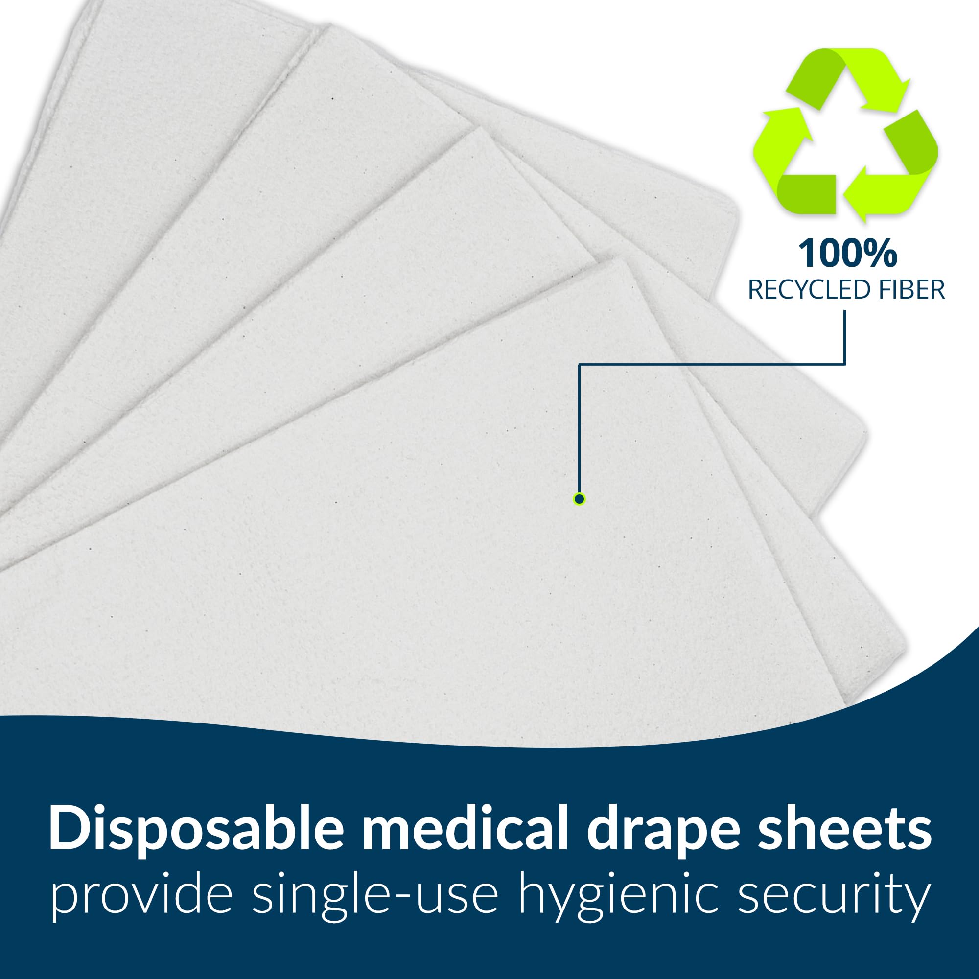 - 100% RECYCLED FIBER, 2-PLY TISSUE, PEBBLE EMBOSSED: Drape sheet construction optimized for everyday use in wide range of healthcare and hygiene-conscious settings